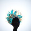 Blue feathers, gold leaves, blue rose on a blue silk headband