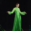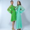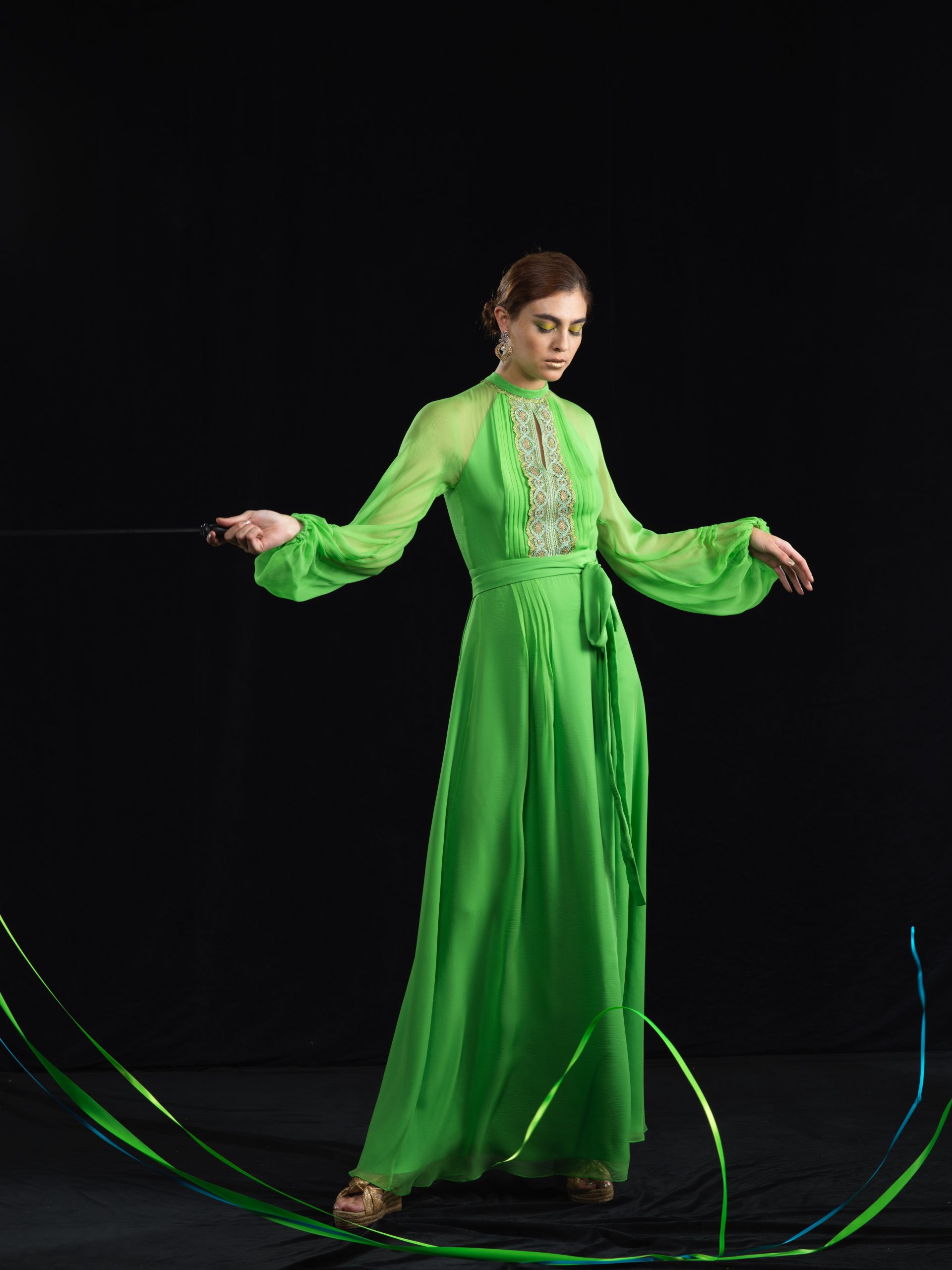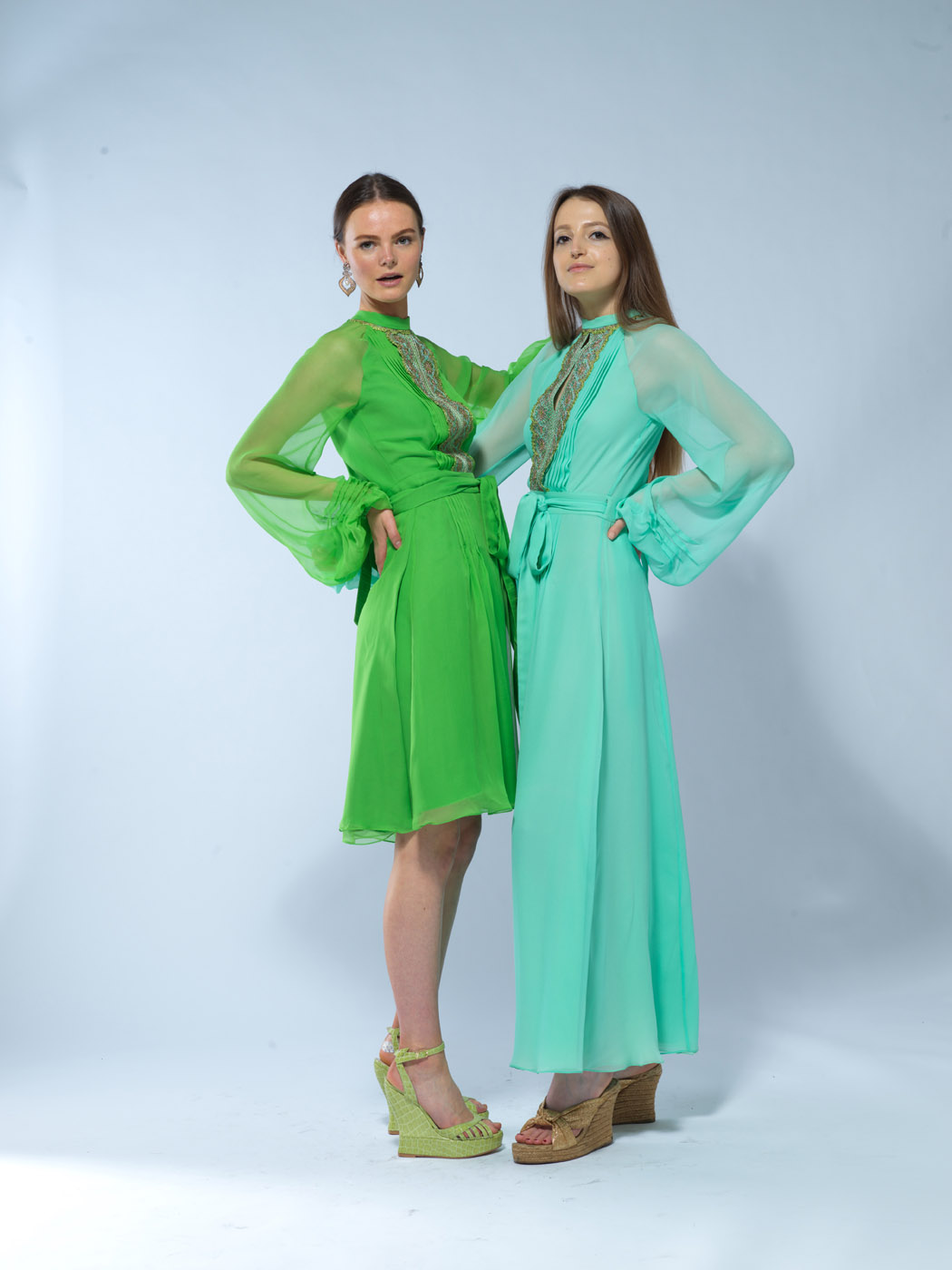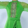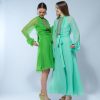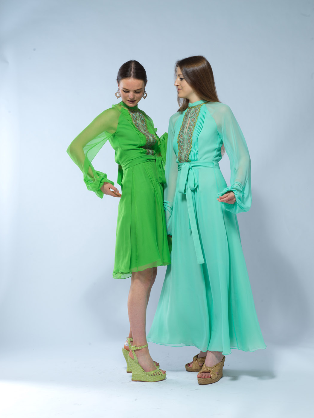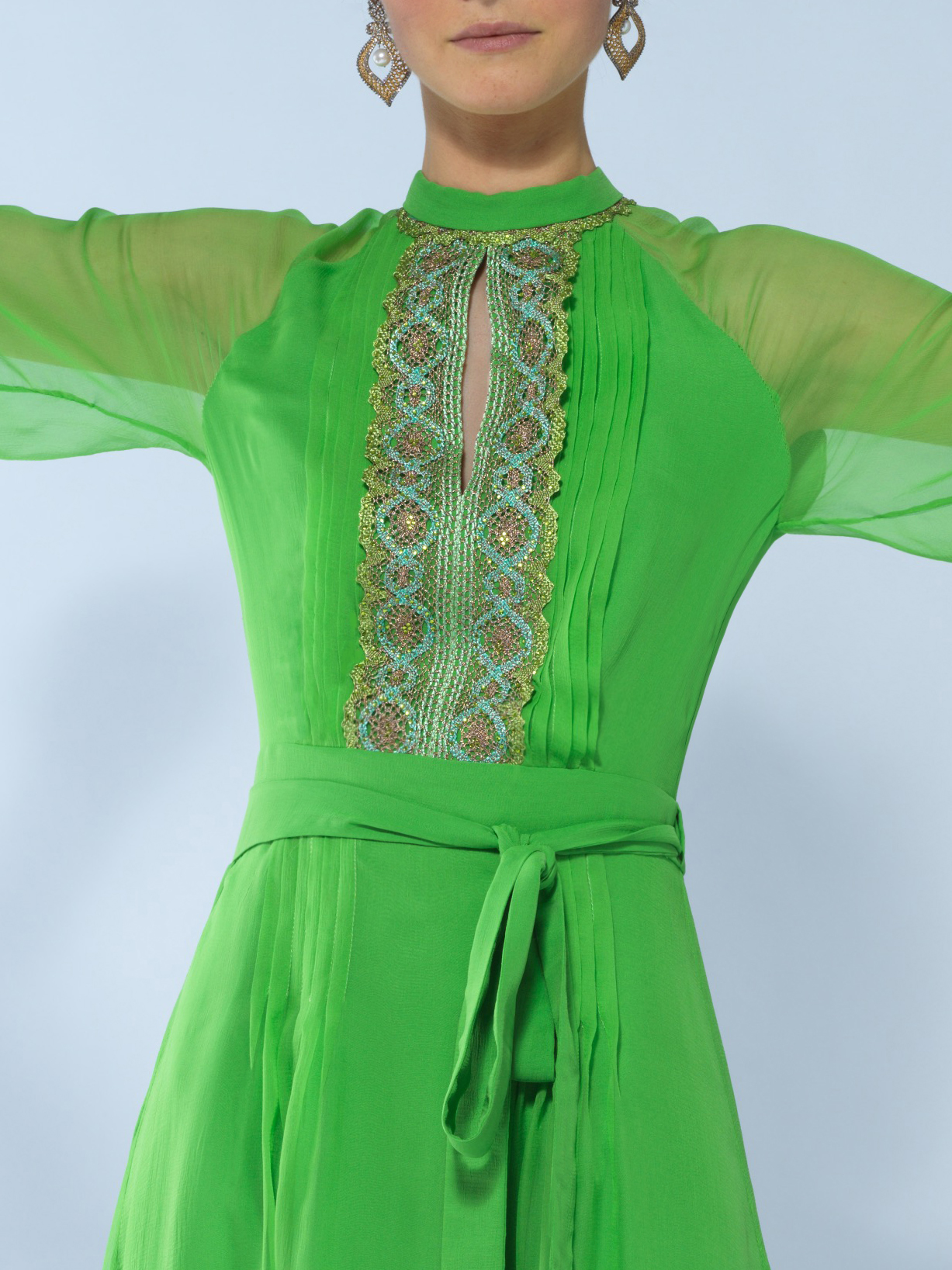 Silk Chiffon wrap dress with pleats down the front & sleeve with lace brocade detailing