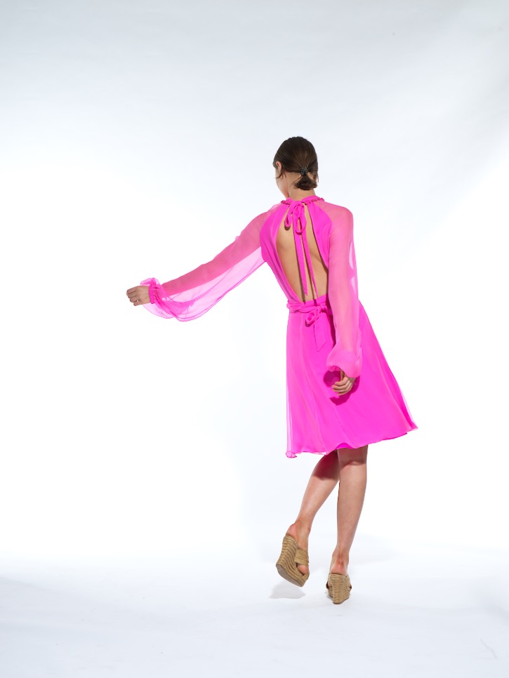 Short Silk Chiffon dress with long sleeves, pleating and lace brocade detailing