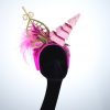 Pink raffia turret, pink sequin leaves, pink ostrich feather on a pink silk headband