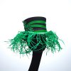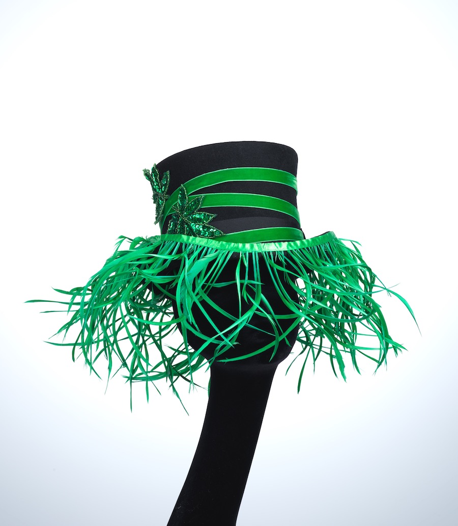Black top hat, long green ostrich feathers and sequin leaf detailing.