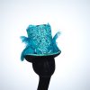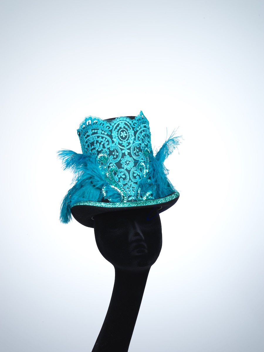 Black tall top hat with turquoise lace detailing, sequined motifs and small ostrich feathers.